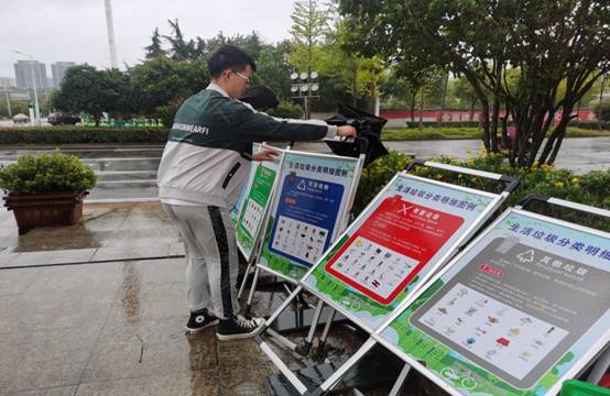 志愿者将被风吹倒的宣传牌扶正摆好