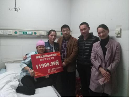 11月10日,在得知消息后,湖南工程学院长沙校友协会在第一时间与张金松取得了联系。核实情况后,长沙校友会发起了“人间自有真情在,爱心捐款暖人心” 的爱心捐款倡议活动。短短四天时间内,78位校友奉献爱心,筹集善款11999.99元。11月15日,长沙校友协会代表沈永详、蔡爽、刘敏一行三人于湘雅附二医院探望了赵云资母女二人,并将善款交到她们手中。校友代表与赵妈妈亲切交谈,了解病情,经过三次化疗,病情明显好转。在校友们的爱心帮助下,赵妈妈战胜病魔的勇气和信心更加充足。赵云资及母亲对校友们的帮助表示衷心的感谢。