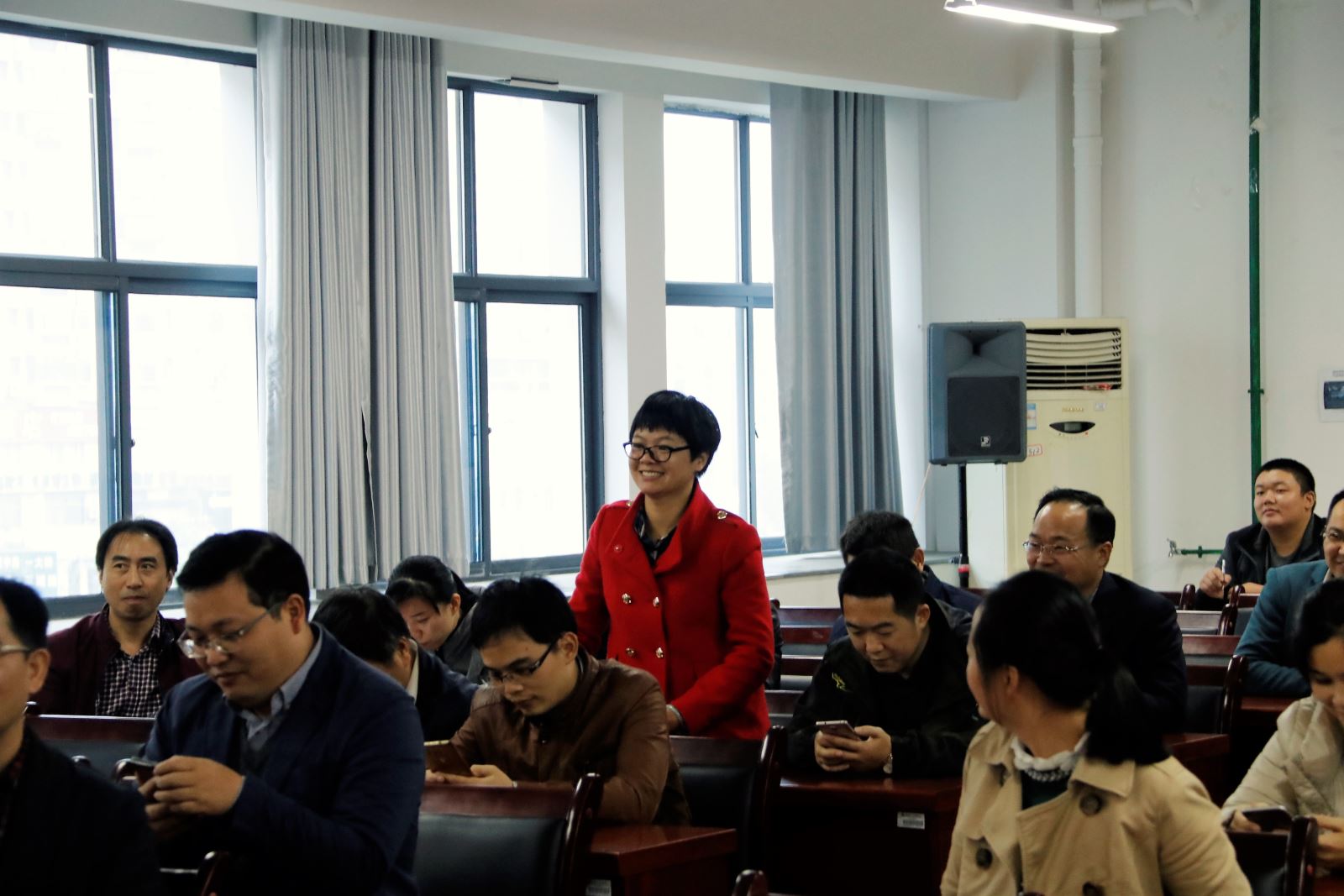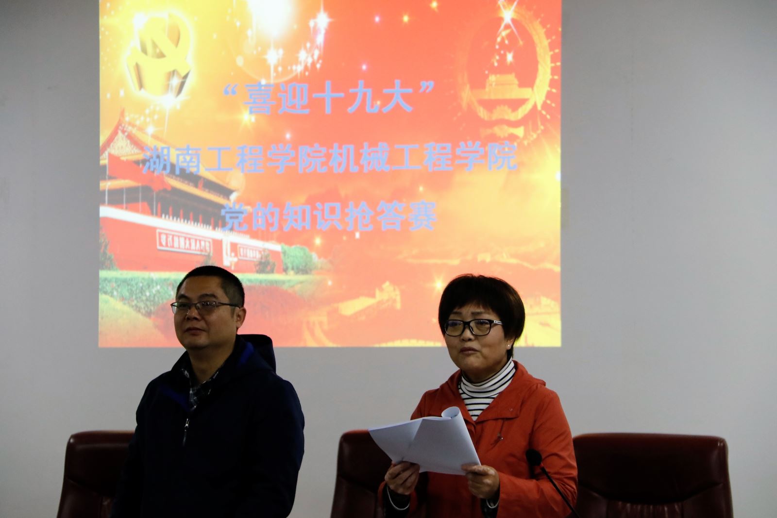 卿上乐首先致辞,他表达了对即将到来的十九大的祝福与期望,并从政治方面和思想方面,简述党员应该如何更好地结合时代主题开展工作。随后,主持人围绕党的基本知识、党的历史、党章党规、系列讲话、党纪党规、作风建设、脱贫攻坚等内容出题,比赛题型分为“选择题,判断题,问答题”三种形式。比赛过程中选手们积极思考,踊跃举手回答,大家争分夺秒的抢答使得比分不分上下,现场氛围热火朝天。在问答题环节,主持人结合歌曲,诗词,图片等对老师们进行提问,部分老师对答如流,逐渐将比分拉开差距,比赛达到高潮。最终,经过激烈的角逐,陈乐尧 、陈玲萍、王娟老师凭借自己扎实的知识和灵敏的反应拔得头筹。