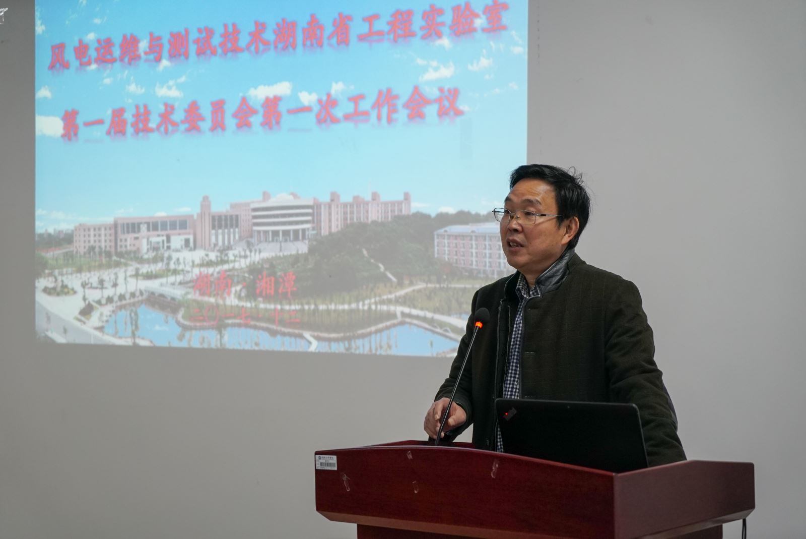 刘国繁致欢迎辞,他介绍了我校的办学历史、基本情况,并着重介绍了我校围绕风电产业三个科研平台——风电装备与电能变换协同创新中心、风力发电机组及控制湖南省重点实验室和风电运维与测试技术湖南省工程实验室的建设情况。他指出,实验室的设施建设与管理是衡量一所高校综合办学实力的重要指标之一,我校始终重视实验室的建设。宁立伟对工程实验室第一届技术委员会的成立表示祝贺,并对各位专家的大力支持表示感谢。罗毅平宣读了工程实验室技术委员会委员的聘任文件,刘国繁为各位专家颁发了工程实验室技术委员会委员聘任证书。