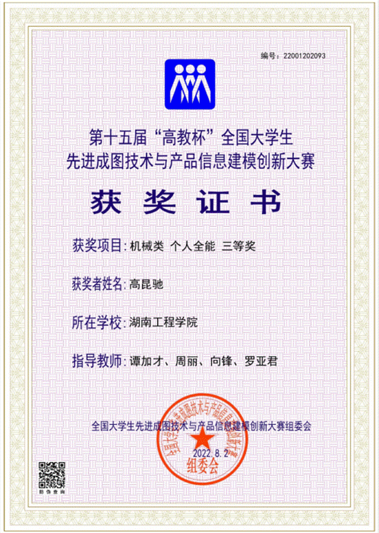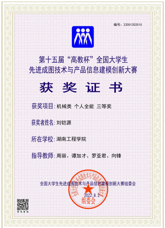 近日,我校学子在第十五届全国大学生先进成图技术与产品信息建模创新大赛中再次取得优异成绩。经过近两个月的努力,机械工程工程学院学子,一路披荆斩棘,荣获第十五届全国大学生先进成图技术与产品信息建模创新大赛湖南省团体三等奖1项、个人全能一等奖1项(高昆驰)、个人全能二等奖2项(刘娟,施文)、个人全能三等奖5项(刘铠源,凌肯,谢星,谢杰,袁霖),并被推荐参加第十五届“高教杯”全国大学生先进成图技术与产品信息建模创新大赛,再次斩获个人全能三等奖4项,获奖同学为高昆驰、刘铠源、刘娟、施文,指导老师由best365英国在线体育范冬英、谭加才、向锋、周丽和罗亚君担任。