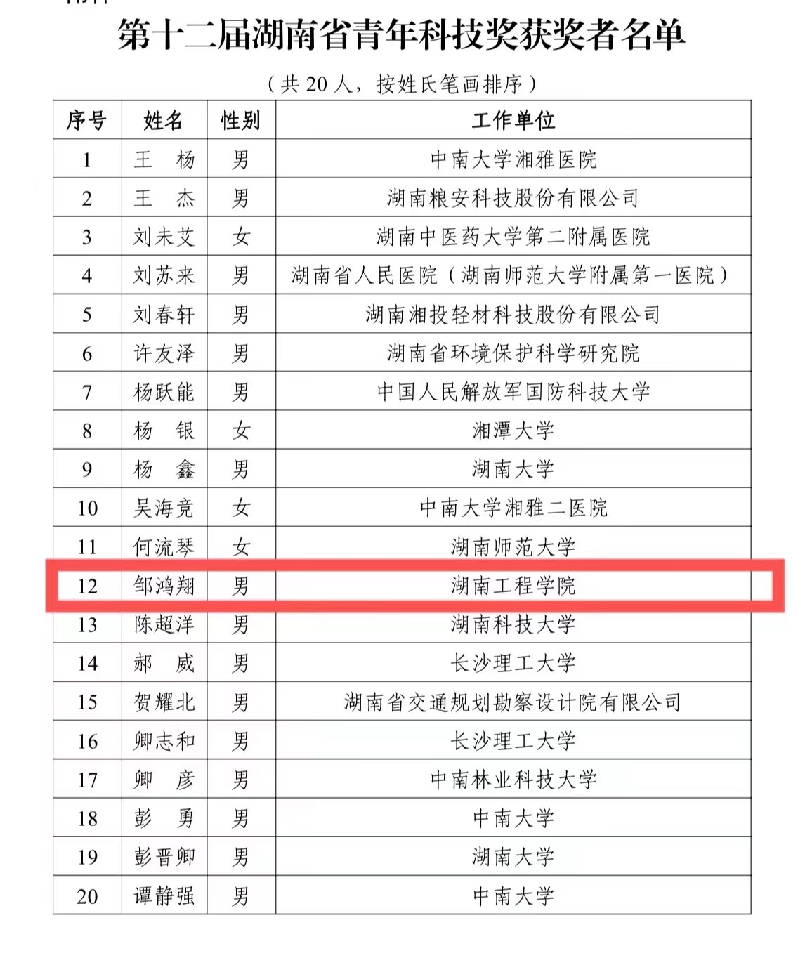 9月21日晚,2023全国科普日(湖南)主场活动暨“科普之夜”晚会在衡阳举办,活动现场为第十二届湖南省青年科技奖20位获奖者颁奖。我校best365英国在线体育邹鸿翔博士荣获“湖南省青年科技奖”称号,并上台领奖。