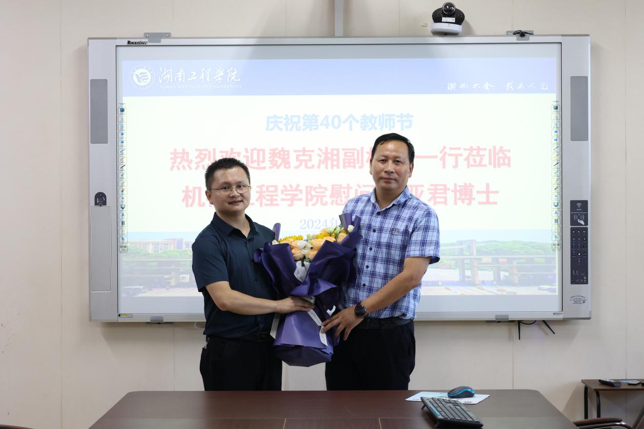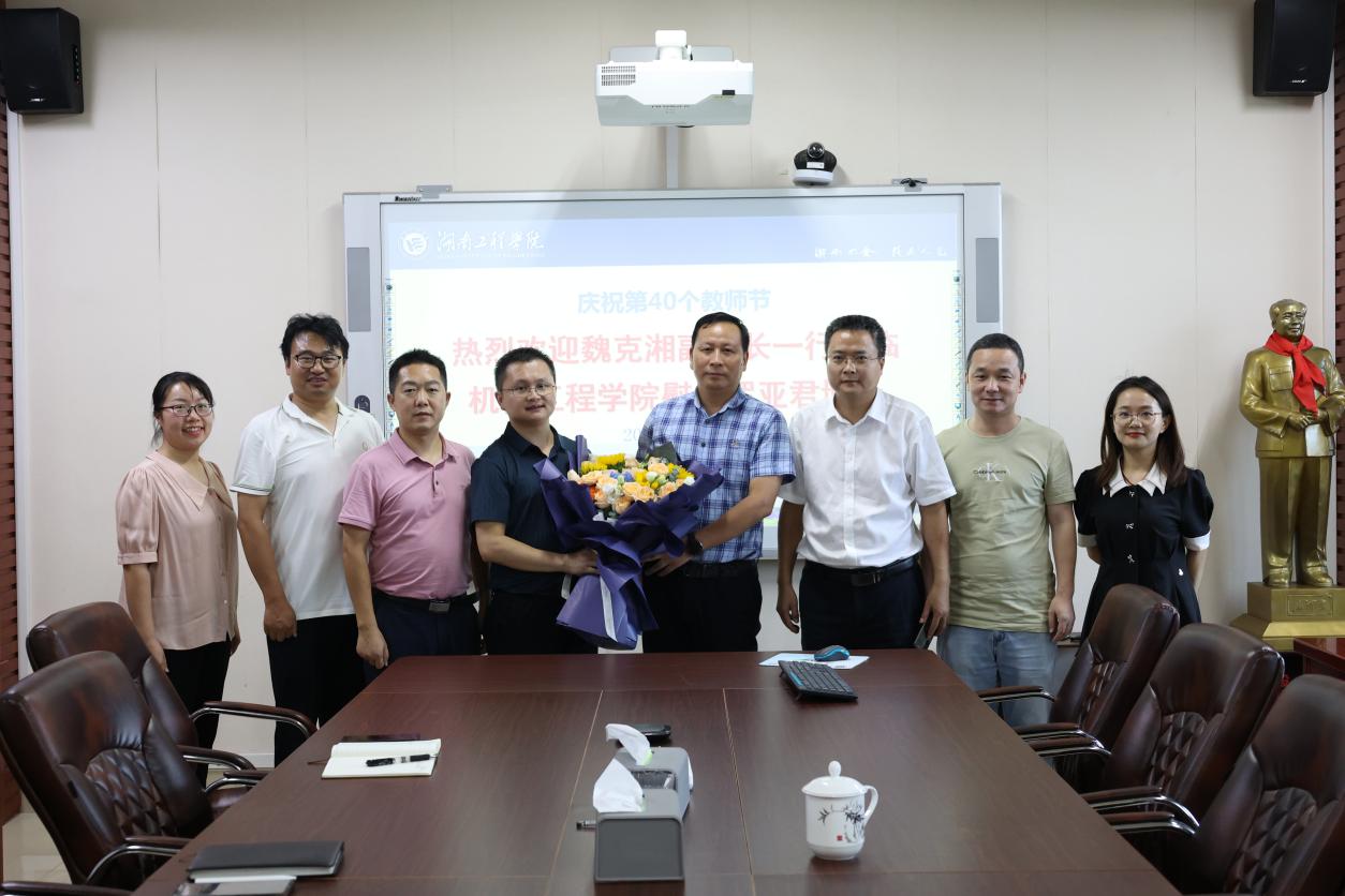 在第40个教师节来临之际,9月6日下午,校党委委员、副校长魏克湘带队来我院走访慰问,代表学校向教师代表罗亚君博士及学院全体教师致以节日的祝福和诚挚的问候,科技管理处处长张细政陪同走访。我院全体院领导参加。