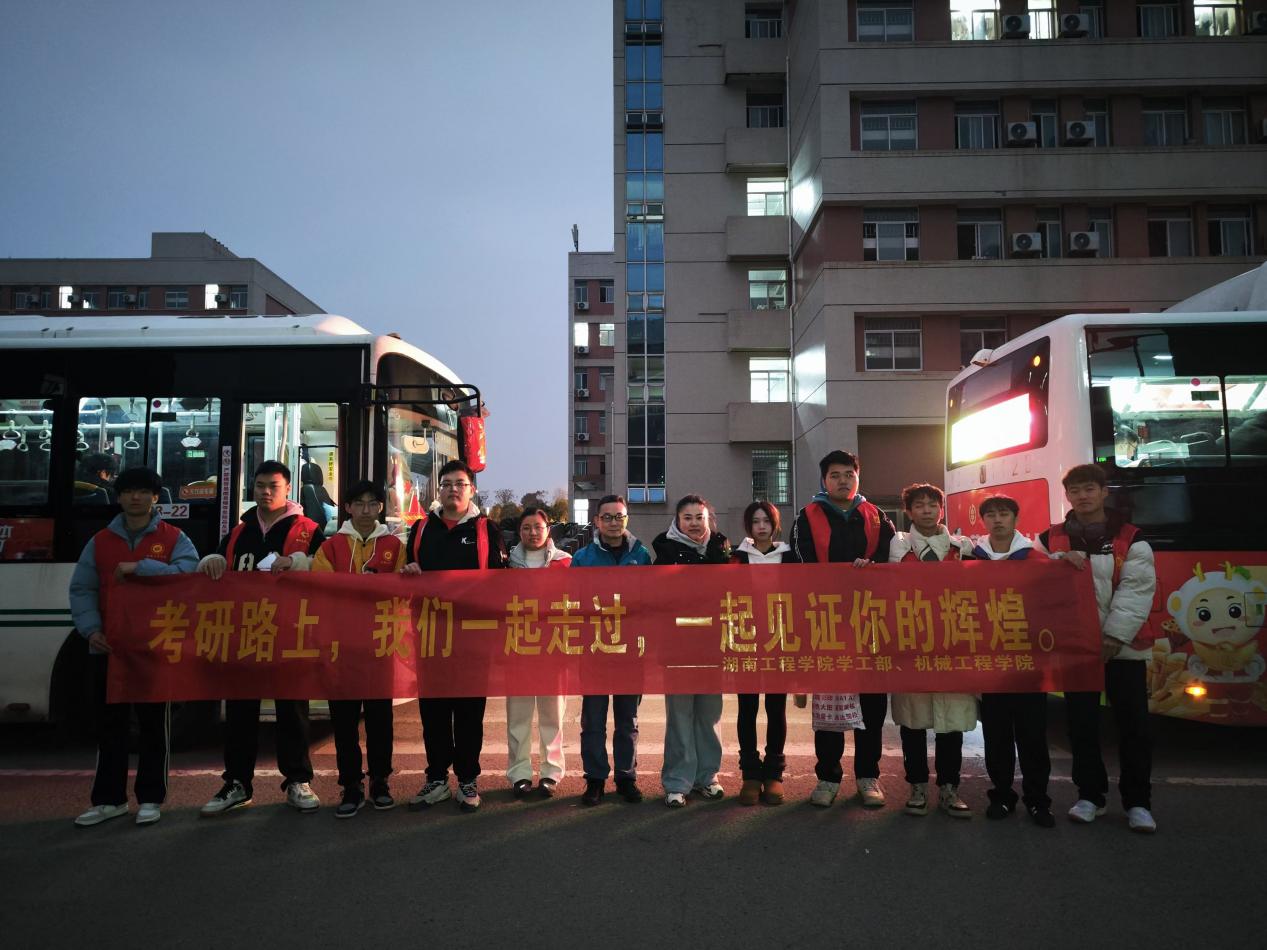 考试当日,晨曦微露时,学院领导、老师及志愿者们就已全部就位。大巴车整齐排列,车前悬挂着鼓舞士气的标语“考研路上,我们一起走过,一起见证你的辉煌”;同时,学院还提前为学生准备了贴心的考研祝福礼包;学院领导也为学子们送上了温馨祝福:“祝机械学子马到成功、一战成硕!”,让同学们充分感受到学院给予的温暖支持与信心力量。