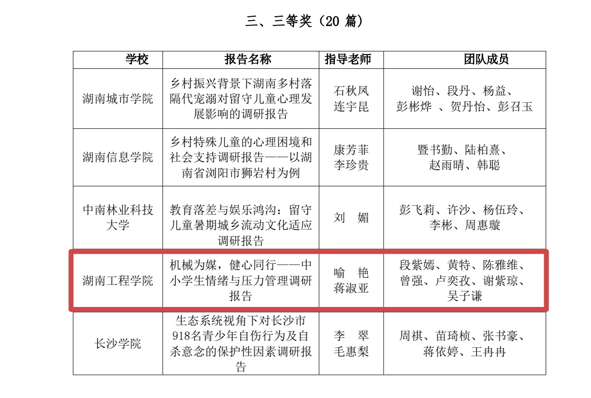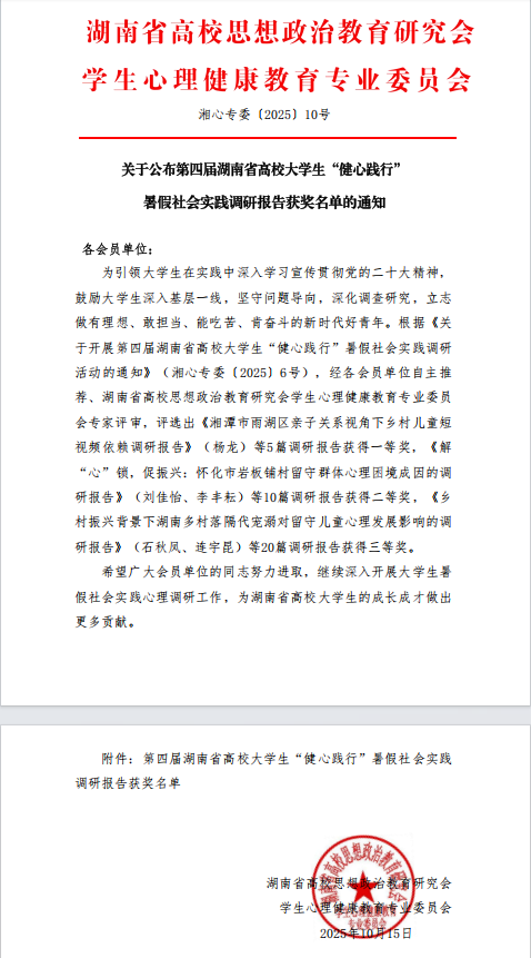 近日,第四届湖南省高校“健心践行”暑期社会实践调研报告评选结果公布。best365英国在线体育提交的《机械为媒,健心同行——中小学生情绪与压力管理调研报告》荣获三等奖。