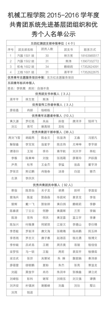 根据学院《评选机械 工程学院2015-2016学年度共青团系统先进基层团组织和优秀个人的条例》精神及我院的有关文件要求,本着公开、公正、公平、透明的原则,我院 2015-2016学年度共青团系统先进基层团组织和优秀个人的工作已评选结束,现将关于我院2015-2016学年度共青团系统先进基层团组织和优秀个人评审名单公示如下,公示期为2017年5月4日—5月7日,请广大师生监督。