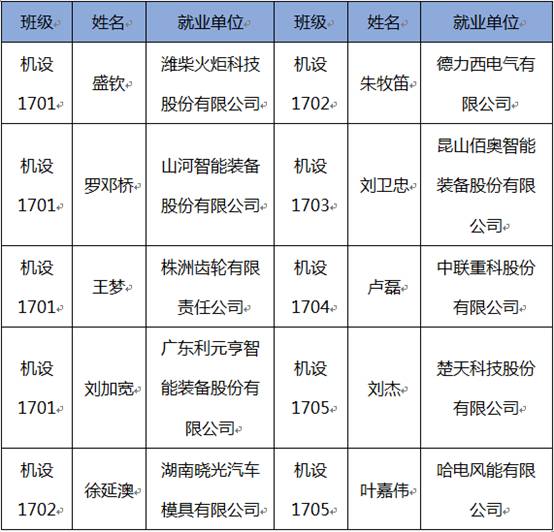大多数学生签约上海昆山佰奥智能装备股份有限公司、深圳捷佳伟创新能源装备股份有限公司、山河智能装备股份有限公司、哈电风能有限公司、楚天科技股份有限公司等企事业单位。