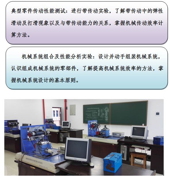 可开设实验:机构分析与机构运动简图测绘、机构创意设计与拼装、平面机构特性分析、轮系机构分析、机械的平衡实验、基本平面机构设计及运动学实验、机械创新设计、典型零件传动性能测试、机械系统组合及性能分析、轴系结构装拆、减速器结构分析、机械构造及机械设计创意
