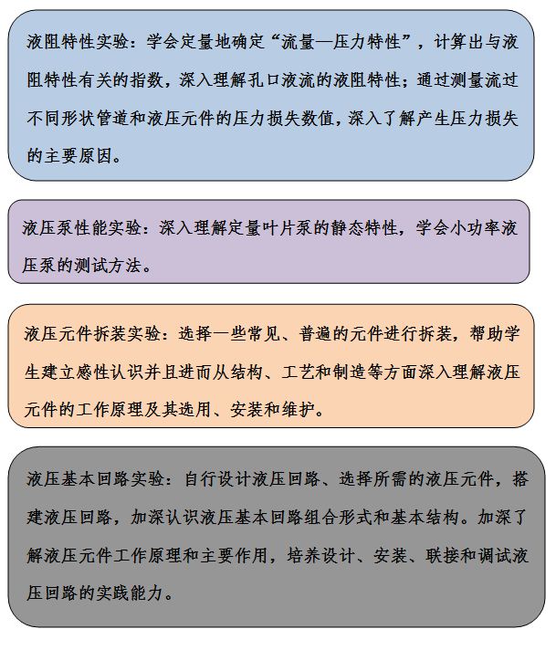 可开设实验:液阻特性实验、液压泵性能实验、液压元件拆装实验、溢流阀静态性能测试、液压基本回路实验、气动回路实验、PLC控制液压回路实验、机-电-液一体化实验等。
